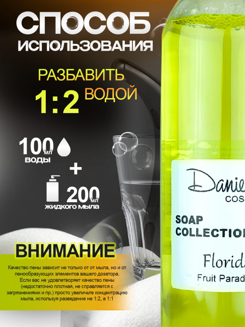 Жидкое мыло для всех видов пенных дозаторов. Образует обильную и густую пену, обладает приятным ароматом. Значительная концентрация активных веществ в составе продукта позволяет использовать разведение мыла 1:1 без ущерба для пенообразования и моющей способности.