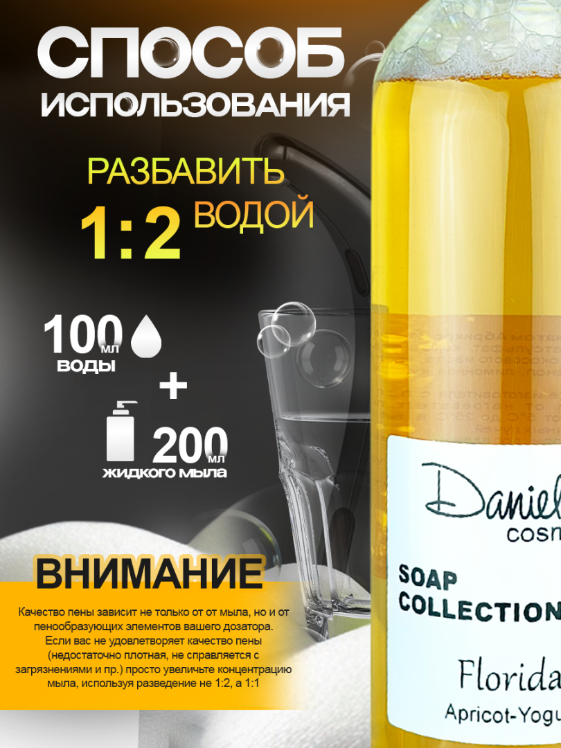Жидкое мыло для всех видов пенных дозаторов. Образует обильную и густую пену, обладает приятным ароматом. Значительная концентрация активных веществ в составе продукта позволяет использовать разведение мыла 1:1 без ущерба для пенообразования и моющей способности.