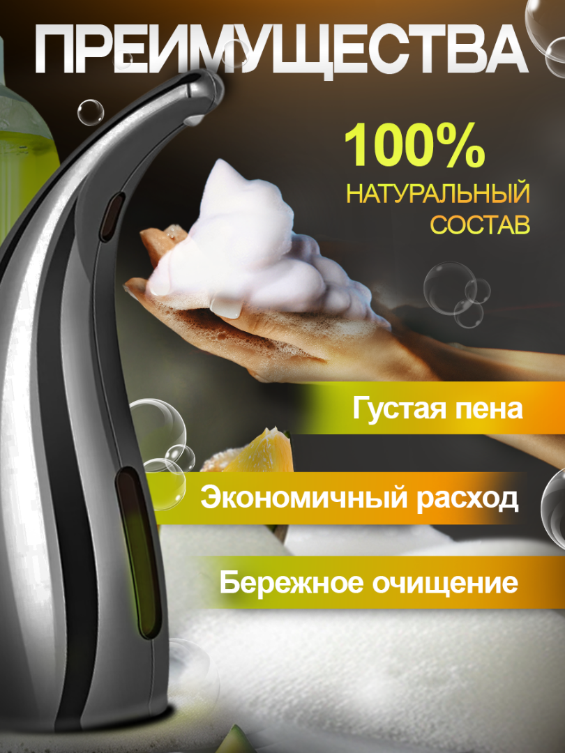Жидкое мыло для всех видов пенных дозаторов. Образует обильную и густую пену, обладает приятным ароматом. Значительная концентрация активных веществ в составе продукта позволяет использовать разведение мыла 1:1 без ущерба для пенообразования и моющей способности.