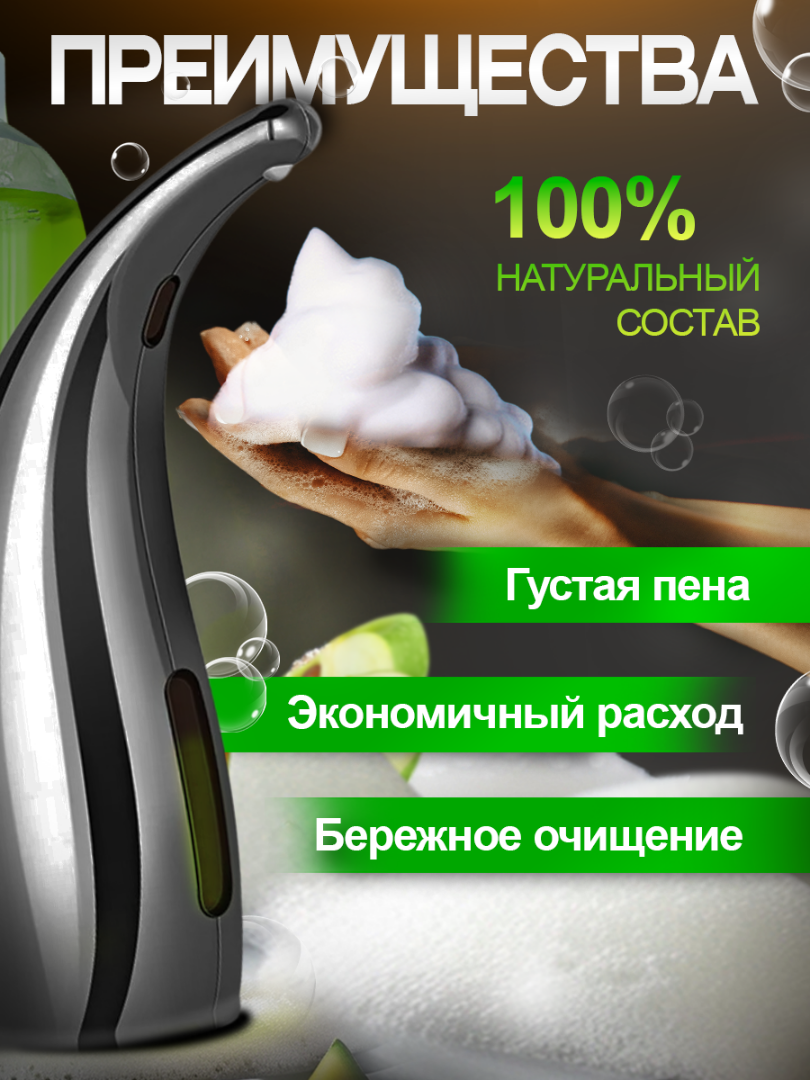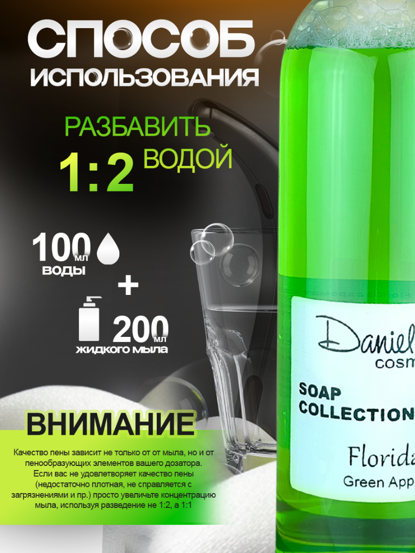 Жидкое мыло для всех видов пенных дозаторов. Образует обильную и густую пену, обладает приятным ароматом. Значительная концентрация активных веществ в составе продукта позволяет использовать разведение мыла 1:1 без ущерба для пенообразования и моющей способности.