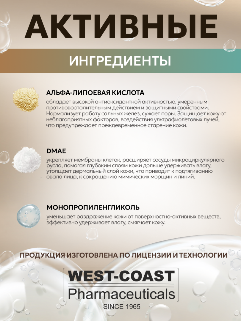 DMAE – укрепляет мембраны клеток, расширяет сосуды микроциркулярного русла, помогая глубоким слоям кожи дольше удерживать влагу, утолщает дермальный слой кожи, что приводит к подтягиванию овала лица, к сокращению мимических морщин и линий
